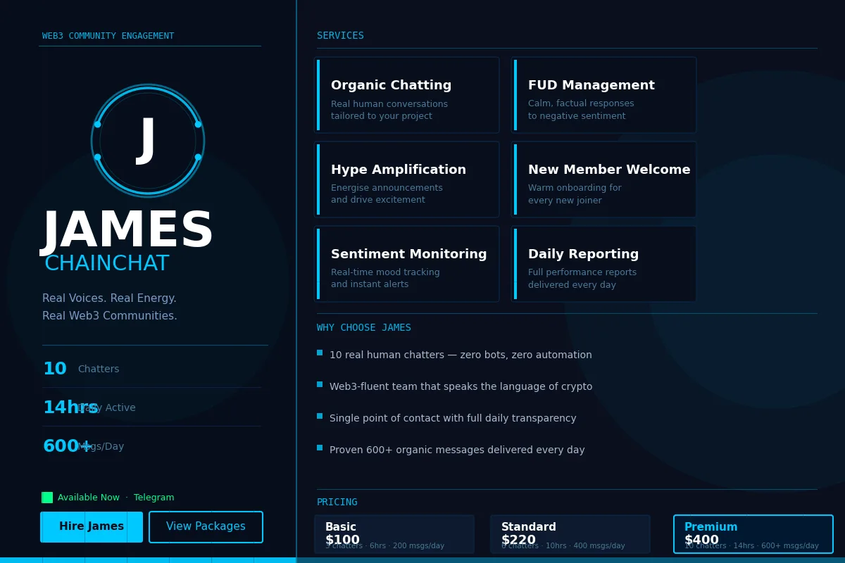 Onboarding & Training — Before deployment, I brief the entire team on your project — its mission, values, tone of voice, key talking points, FAQs, and community guidelines. Every chatter is trained to represent your project authentically and accurately.
