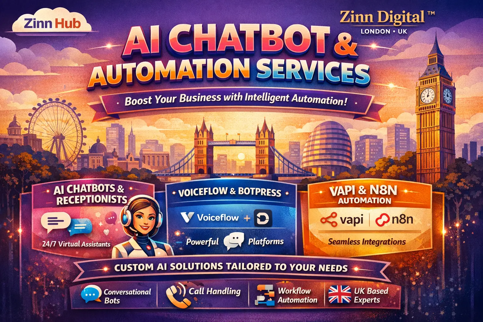 Don't miss this opportunity to elevate your business with our top-notch AI Chatbot development services using Botpress, Voiceflow, Vapi, and Zapier. Contact Zinn Hub now and implement our AI Automation and AI Chatbot services in your business. Let's embark on a journey of AI automation, efficiency, and unmatched customer experiences!