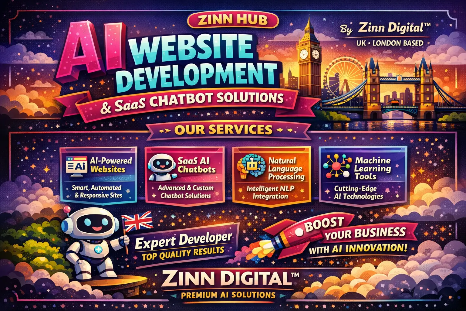 With 4 years of experience, Zinn Digital ™ specialises in custom website development with AI chatbot integration to make websites more engaging, automated, and user-friendly. Whether you want to build a business site, an e-commerce platform, or a personal blog, we can help you create your dream website from our London, England base.