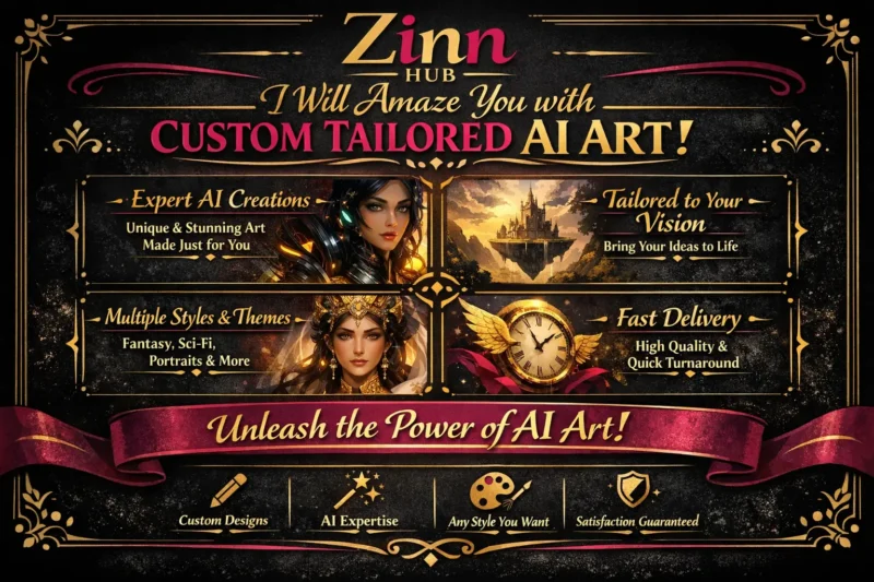 We offer custom-made art pieces and animations across various styles, themes, and palettes, all according to your wishes. Ideal for personal use, social media, or professional projects, our Zinn is designed for those who seek excellence without any prior knowledge needed.