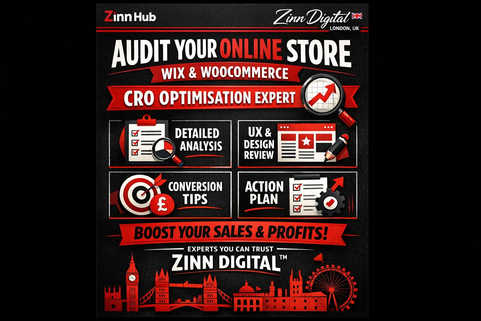 Hello! I'm a CRO expert and UX/UI designer from Zinn Digital ™, based in London, England, specialising in conversion optimisation for online stores. I've completed 500+ CRO audits across multiple platforms, and I know exactly where e-commerce websites lose conversions and how to fix it quickly.