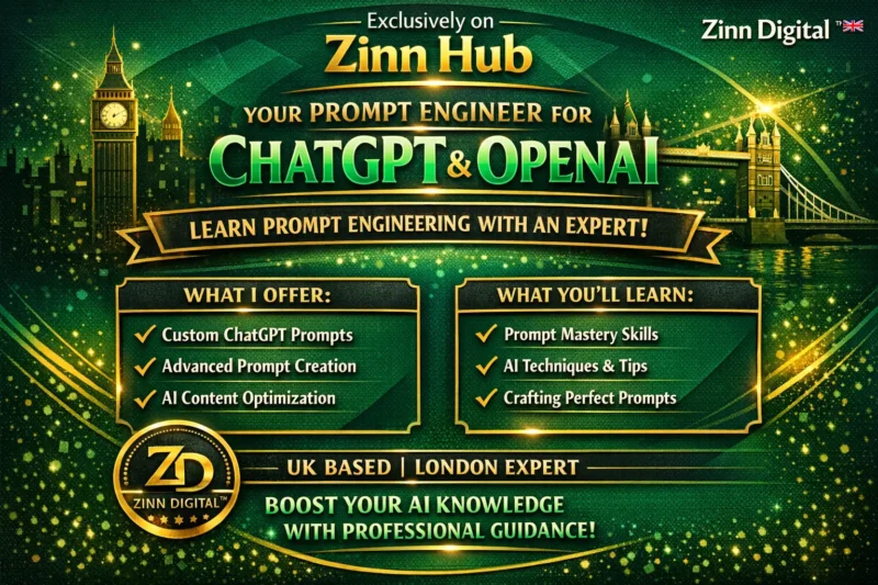 Zinn Digital ™, based in London, England, are your professional prompt engineers with 2 years of specialised experience. We're ready to help you maximise value from this revolutionary AI tool! We provide advanced, customised prompts for your projects alongside actionable guidance to ensure complete project fulfilment, delivering exactly what you need from GPT-3 and AI technologies.