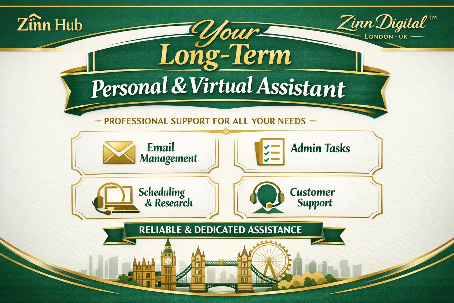 I'm Zinn Digital ™, a highly skilled Virtual Assistant with 8 years of experience providing expert support as a personal assistant, executive assistant, and general assistant across industries. Whether you need help with administrative tasks, customer support, project management, data entry, or content creation, we're here to help streamline your operations from our base in London, England.