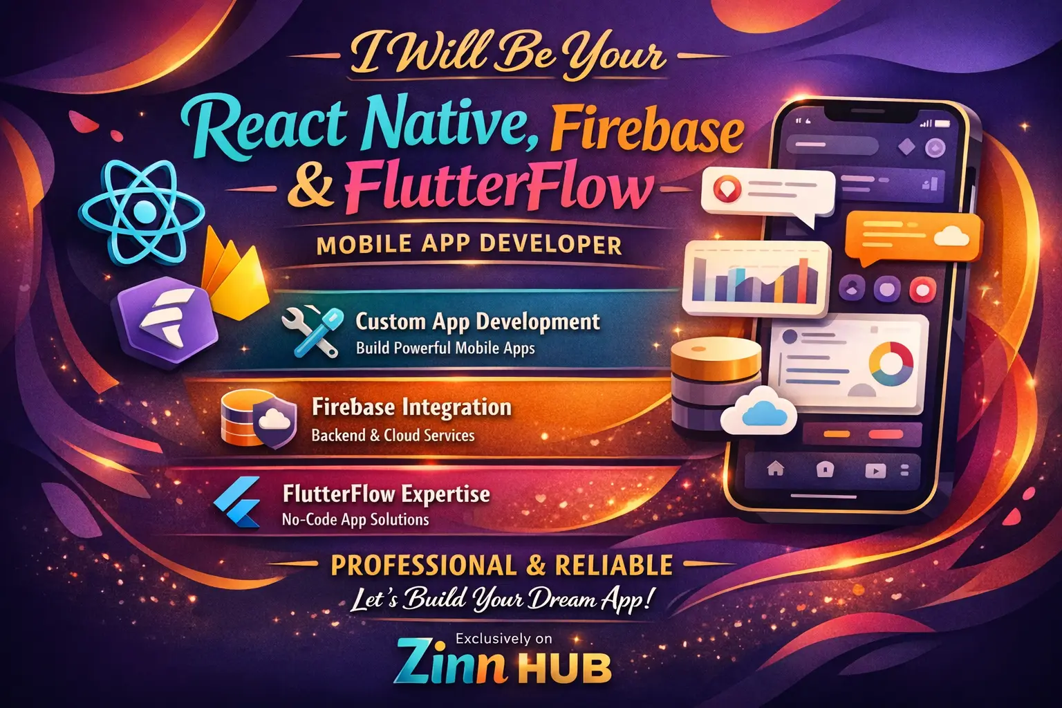I will be your React Native, Firebase, and FlutterFlow mobile app developer, delivering high-quality Android and iOS apps. Based in London, England, Zinn Digital ™ specialises in FlutterFlow mobile app development, bug fixing, new features, and performance optimisation to make your app fast, stable, and user-friendly.