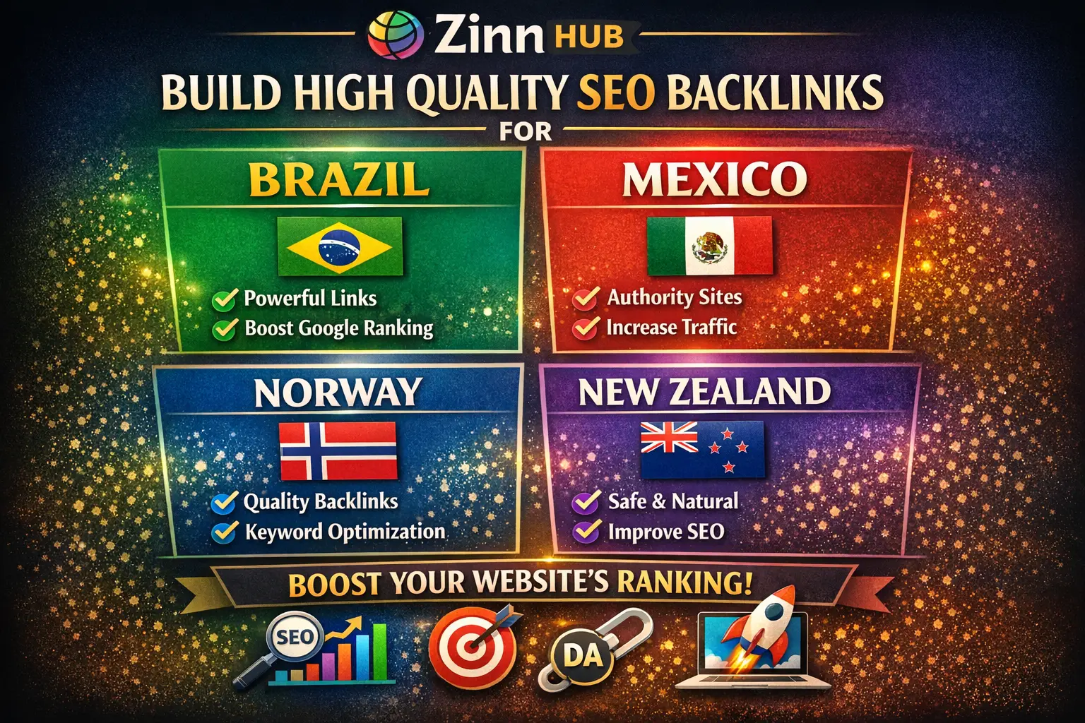 If you're targeting audiences in Brazil, Mexico, Norway, or New Zealand, this service is designed for you! We'll build high-quality, white-hat backlinks that strengthen your website's authority, visibility, and organic ranking performance.