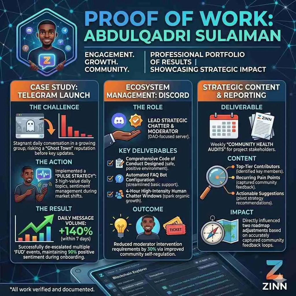 Elevate Your Community from "Active" to "Unstoppable" In the fast-paced world of decentralized platforms, a community’s strength isn’t measured by member count, but by the quality of its pulse. Managing a digital space requires more than just moderation; it requires a dedicated architect of conversation. I am Abdulqadri Sulaiman, a Community Management Specialist and Strategic Chatter focused on turning stagnant groups into thriving, high-engagement ecosystems where every member feels heard and every discussion adds value.