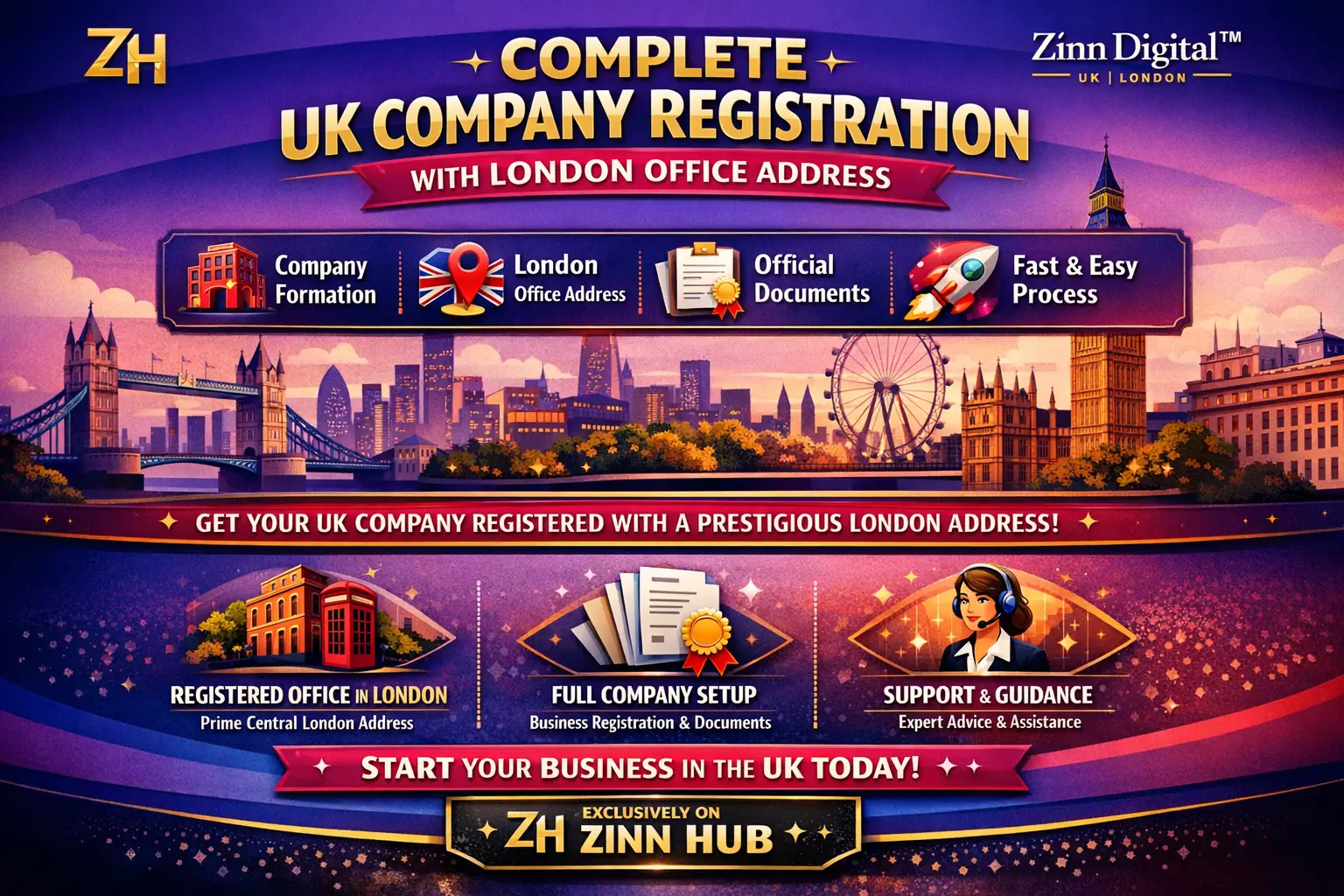 If you are not a London resident and looking for UK company registration, Zinn Digital ™ can help you with your UK ltd formation. We are also registered UK tax agents and will help you manage all quarterly/annual taxes for your UK business.