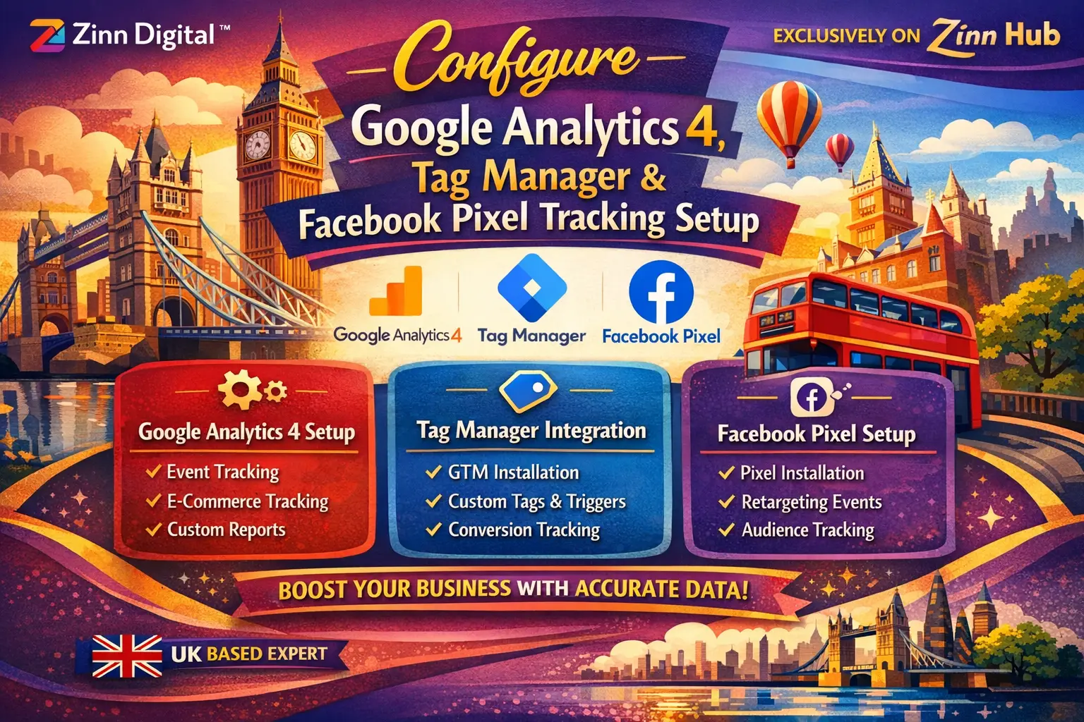 Zinn Digital ™ specialises in setting up Google Tag Manager, Google Analytics 4 eCommerce tracking, Facebook Pixel, and Google Ads conversion tracking for Shopify, WooCommerce, Wix, and more platforms.