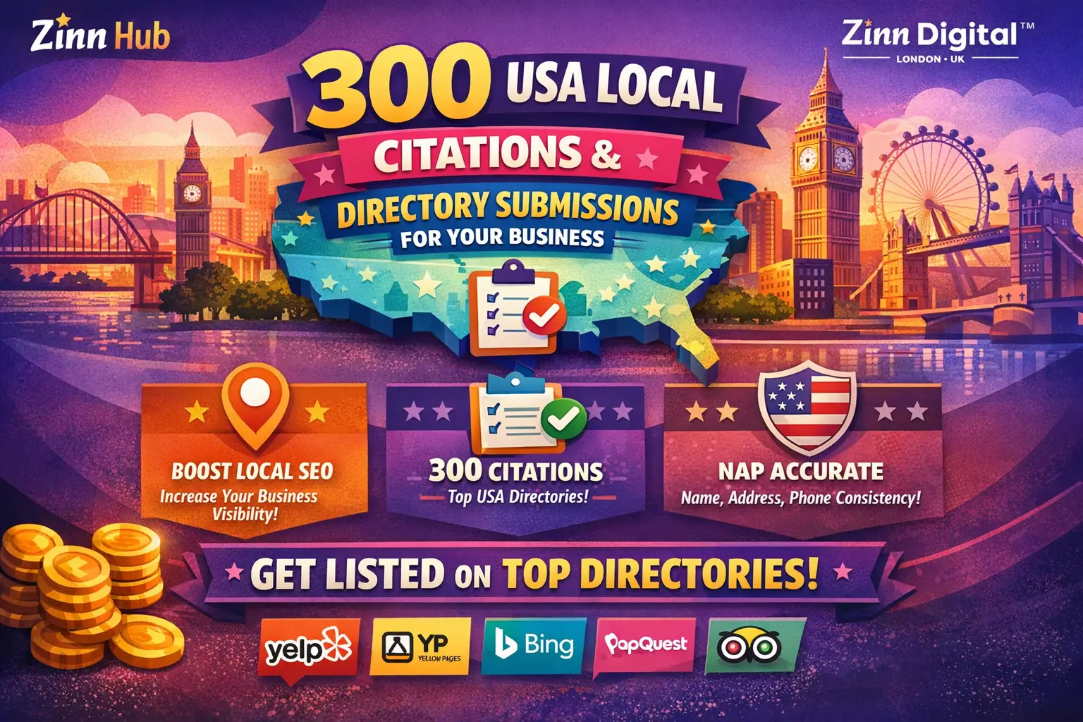 Zinn Digital ™ will manually submit your business to 50/200/300+ High-Quality Local Citation Directories with 100% accurate NAP (Name, Address, Phone) to improve your website's local SEO, boost Google Maps ranking, and increase keyword visibility. With 80%+ indexing guaranteed, this service drives real results and helps your business rank higher in local search.