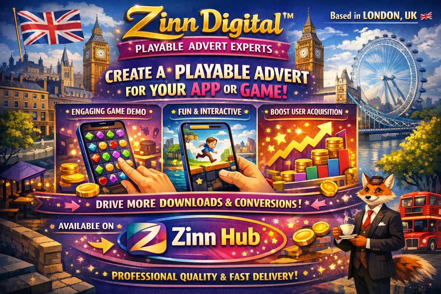Based in London, England, Zinn Digital ™ specialises in creating innovative playable adverts that drive app downloads and user engagement. Looking to take advantage of a unique new advertising format for your mobile app or game? **Get in touch and we'll make it happen!**