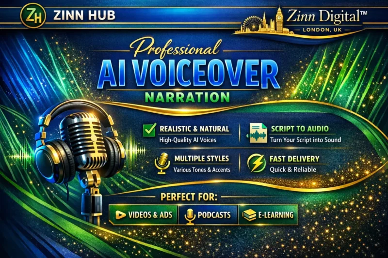 Need a top-quality narration delivered in hours, not days? Zinn Digital ™ uses cutting-edge Text-to-Speech (TTS) AI to convert your script into a clear, professional, and natural-sounding audio track suitable for any project.