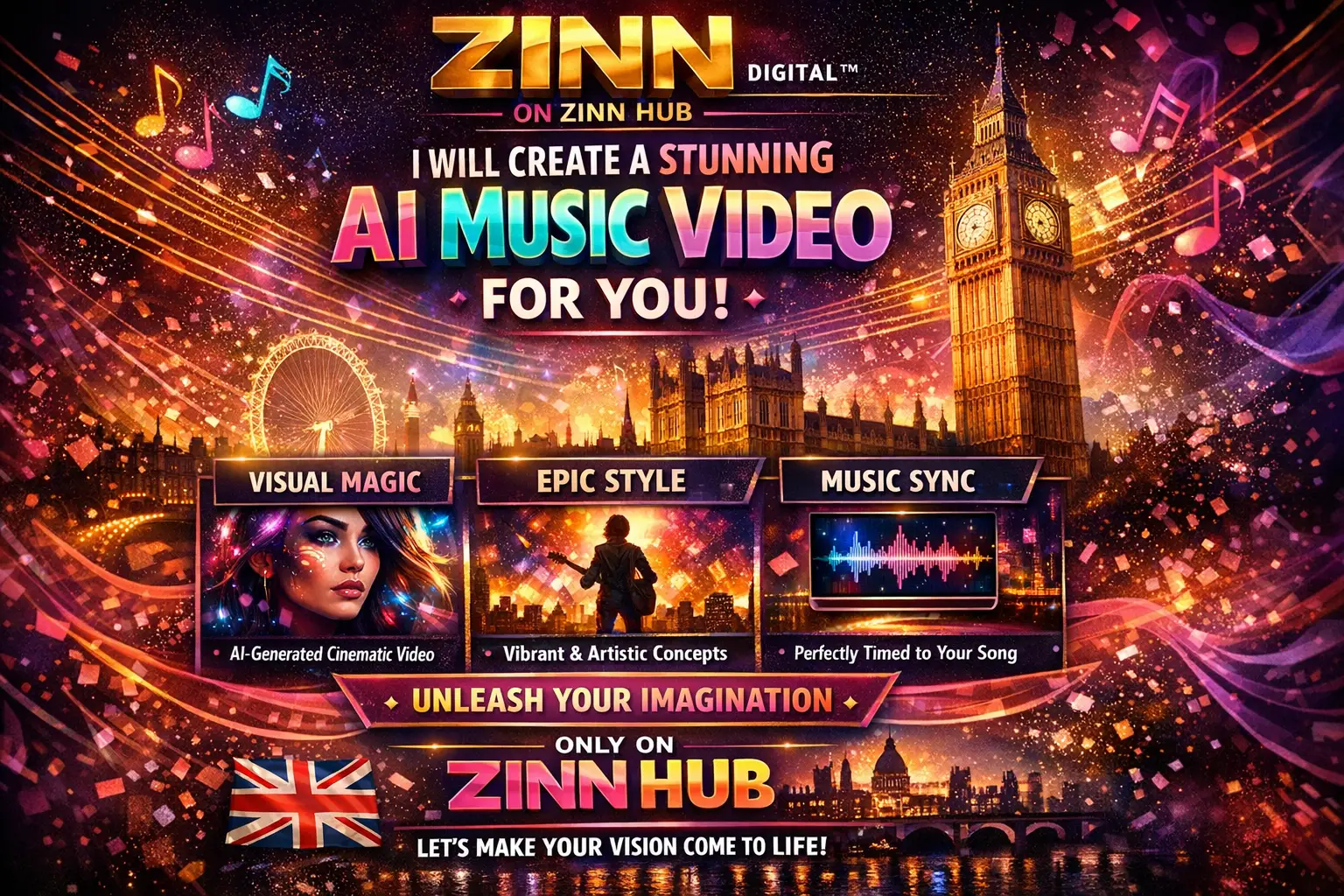Zinn Digital ™ specialises in crafting bespoke AI-generated music videos that bring your unique artistic vision to life. Whether you require a captivating Spotify Canvas, a dynamic song visualiser, or eye-catching AI-generated gifs, we're here to make your music visually unforgettable.