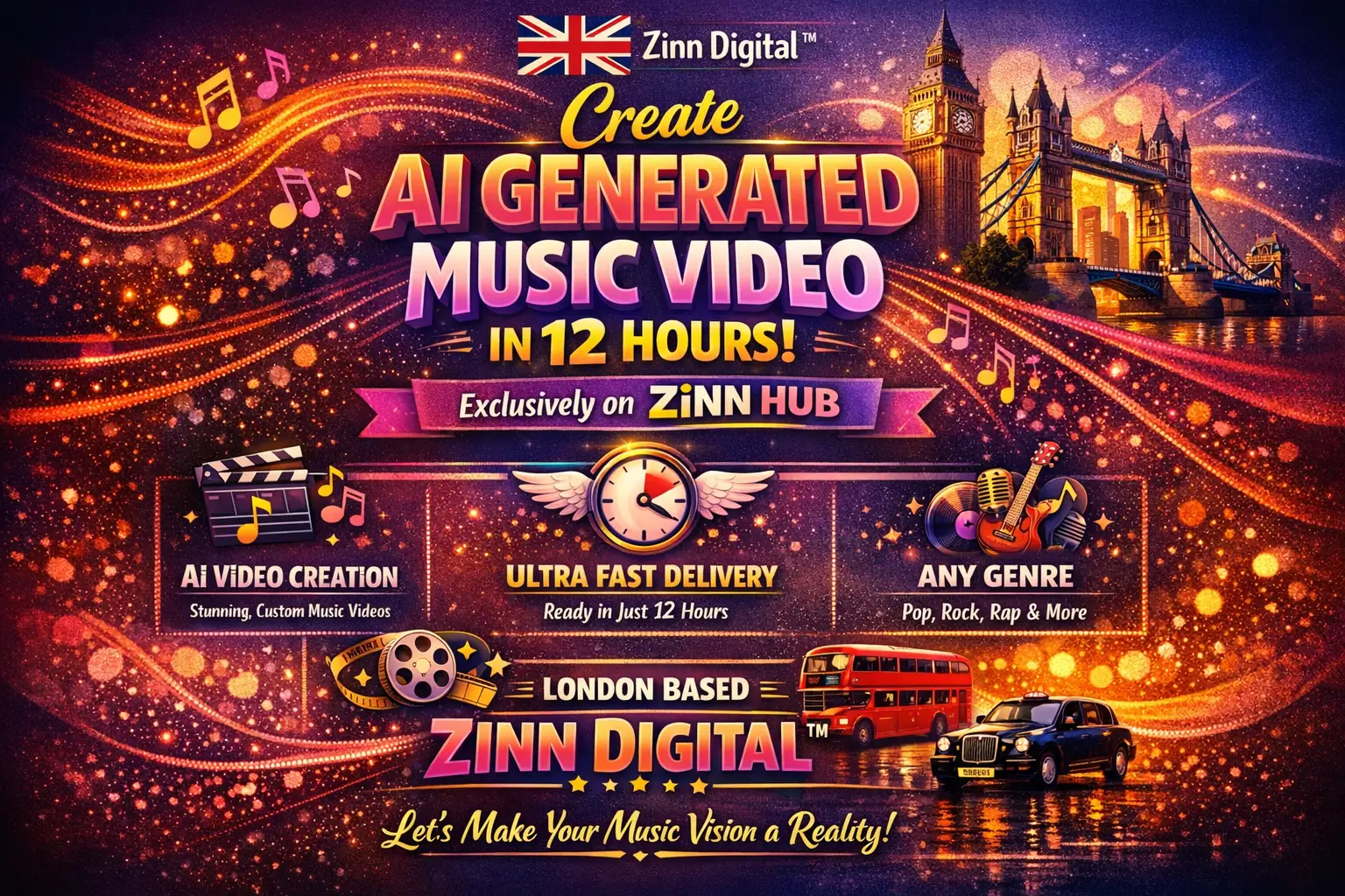Are you an artist, band, or content creator looking for a stunning music video to bring your tracks to life? Look no further! Zinn Digital ™ offers AI-generated music videos delivered in just 12 hours, tailored to your song's vibe and message from our London, England base.