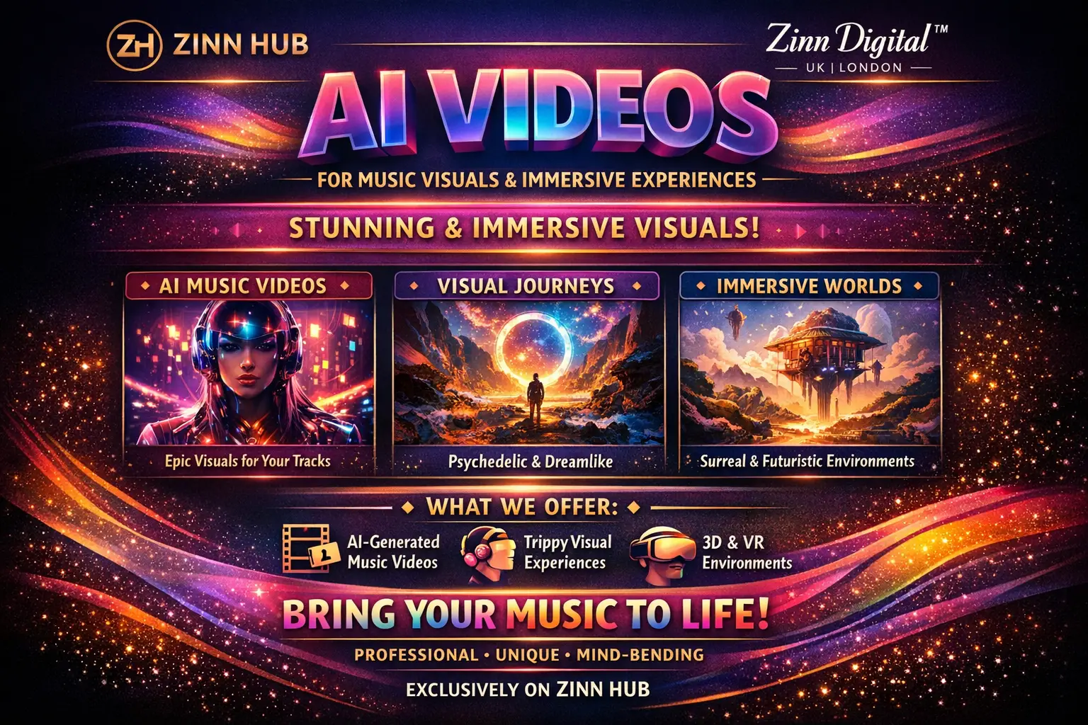 Based in London, England, Zinn Digital™ specialises in transforming musical compositions into stunning visual narratives that captivate audiences and enhance your artistic vision.