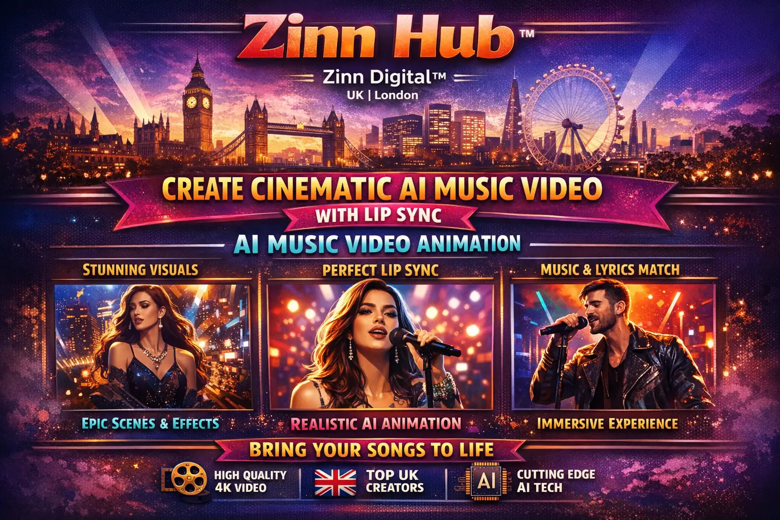 Are you seeking a high-quality, engaging, and unique AI-generated music video that perfectly matches your song's vibe? Look no further! Zinn Digital ™ specialises in creating eye-catching, professional AI music videos tailored to your artistic vision. Based in London, England, with a keen eye for detail and a commitment to excellence, we ensure that each video reflects the essence of your music.