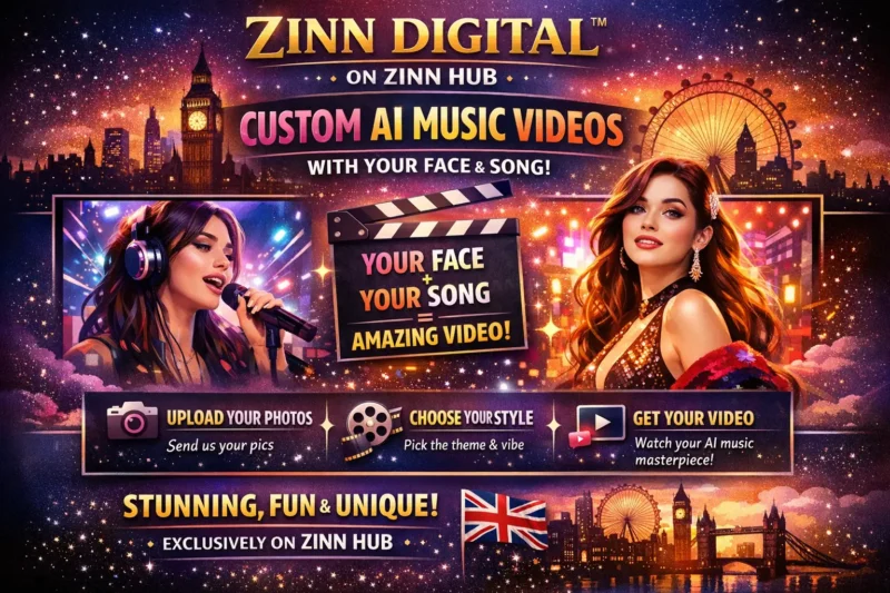 Are you looking for a high-quality, cinematic music video or film scene without the need for cameras or a full production crew? Zinn Digital ™ will create stunning AI-generated videos tailored to your song, script, or creative idea.
