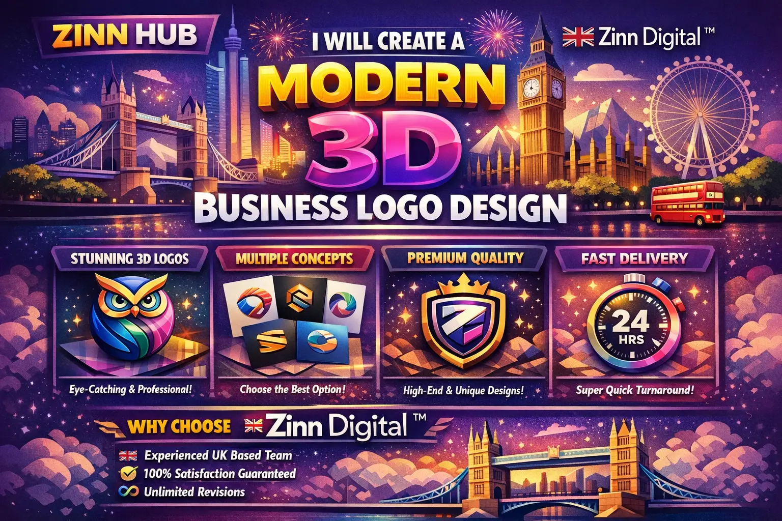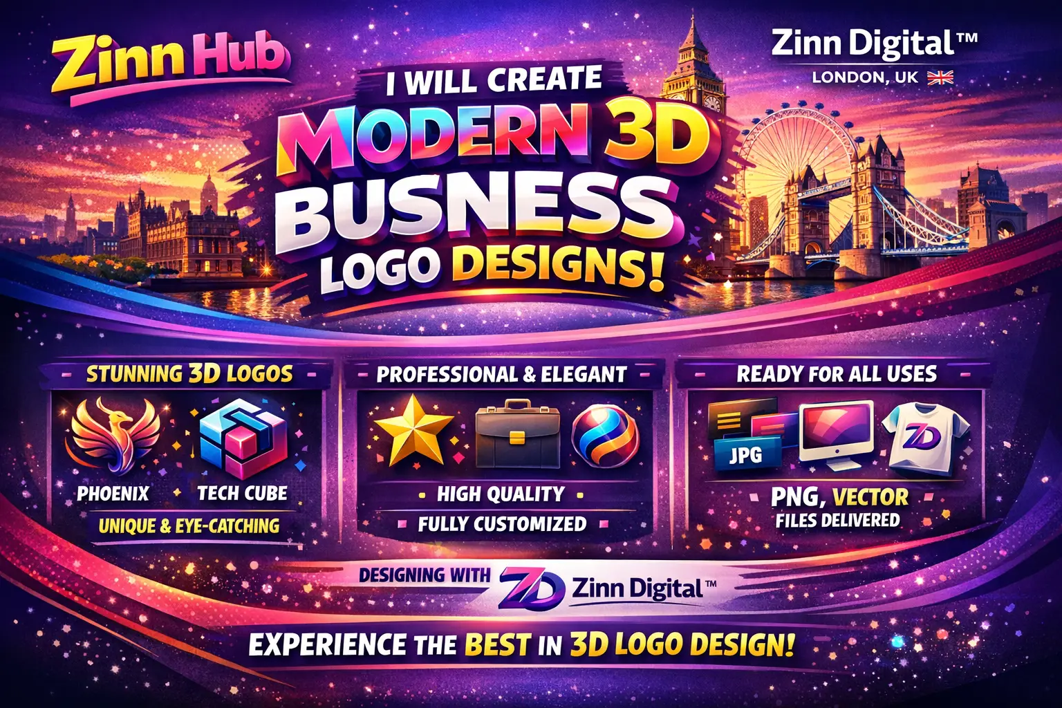 We create high-impact 3D logos that make your brand pop off the screen and into your customers' minds. Based in London, England, Zinn Digital ™ specialises in sleek, modern, and luxury 3D designs, transforming your vision into a dimensional brand identity that commands attention.