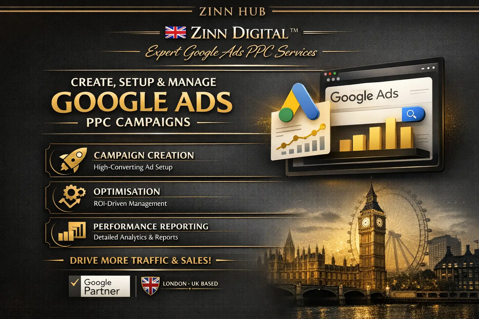 Look no further! At Zinn Digital™, we specialise in creating, setting up, and managing Google Ads (AdWords) PPC campaigns that drive quality traffic, increase sales, and maximise your return on investment.
