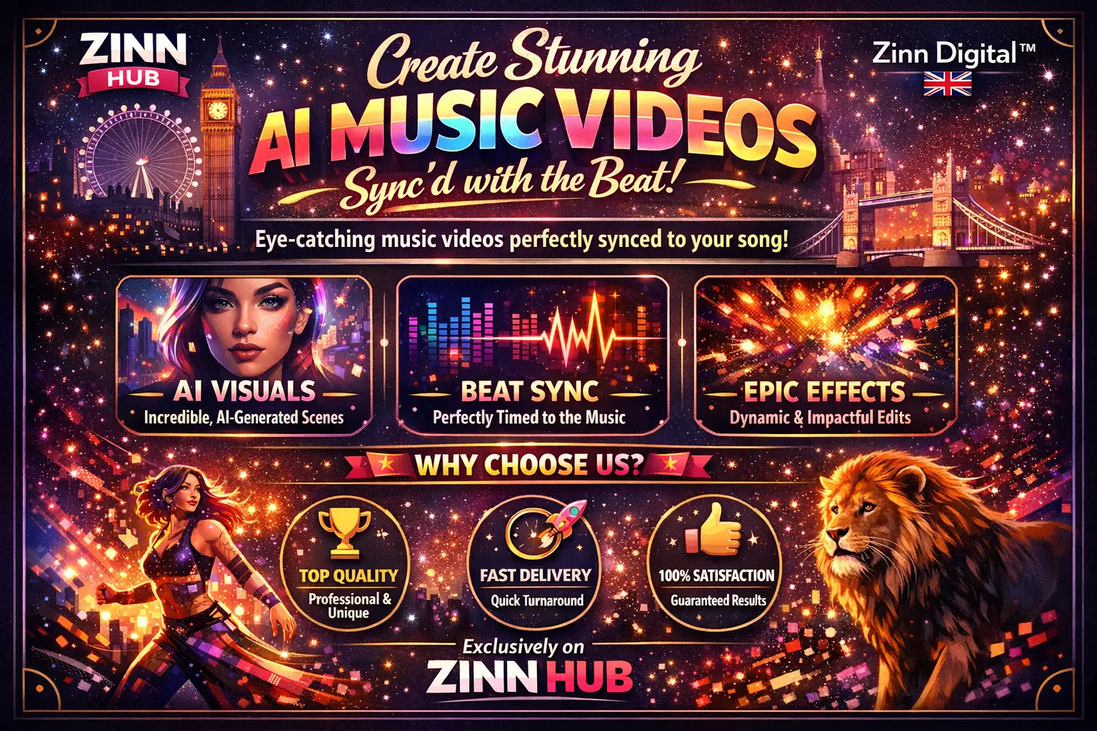 **Why choose Zinn Digital™, you ask? Next-Level Creativity**: Mesmerising AI animation visuals rendered in stunning 60 frames per second and 4K resolution, ensuring every moment is **captured** in the highest quality. But that's just the beginning. Our London, England based team elevates your music to new heights with dynamic video editing, seamless effects integration, and beat-synced cuts that breathe life into each frame. Gone are the days of mundane, monotonous visuals - we transform your music into a modern, visually engaging masterpiece using the newest AI technologies.