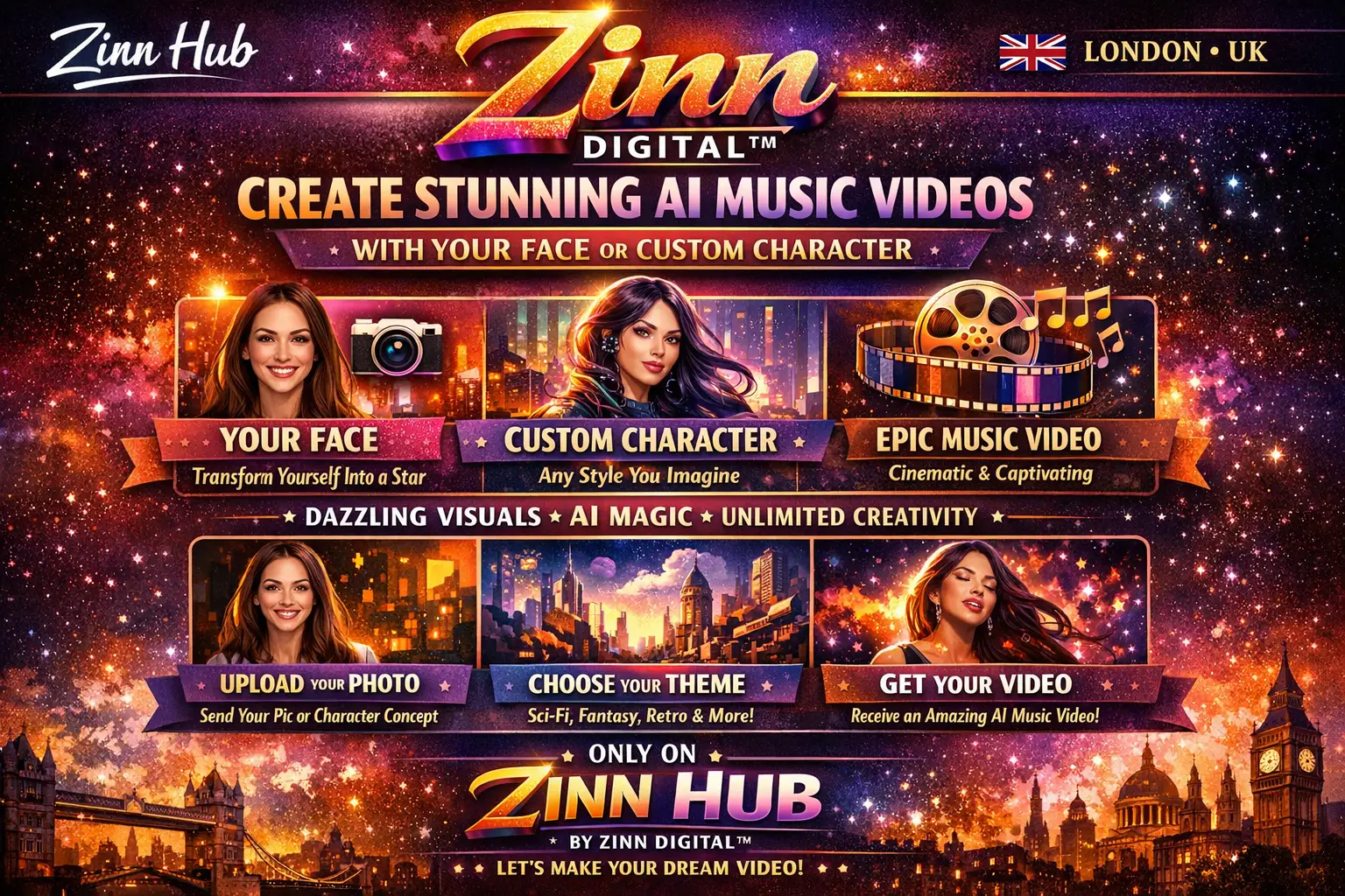 Want a unique AI-generated music video? Zinn Digital ™ specialises in creating personalised music videos with your face or a custom character. Using advanced AI, we'll sync your music with stunning visuals that feature you or a character of your choice.