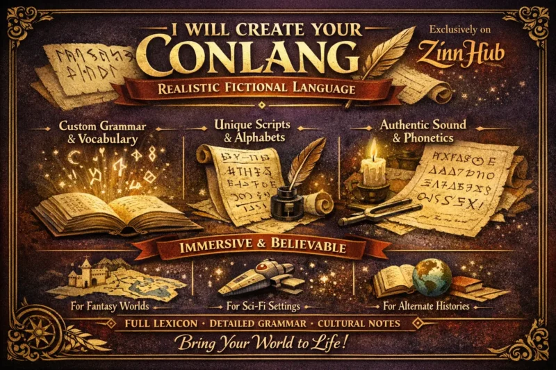As a trusted Zinn Hub provider of professionally constructed fantasy languages with 20 years of conlanging experience, I deliver EVERY Zinn with a comprehensive, HIGH-QUALITY PDF, spanning: