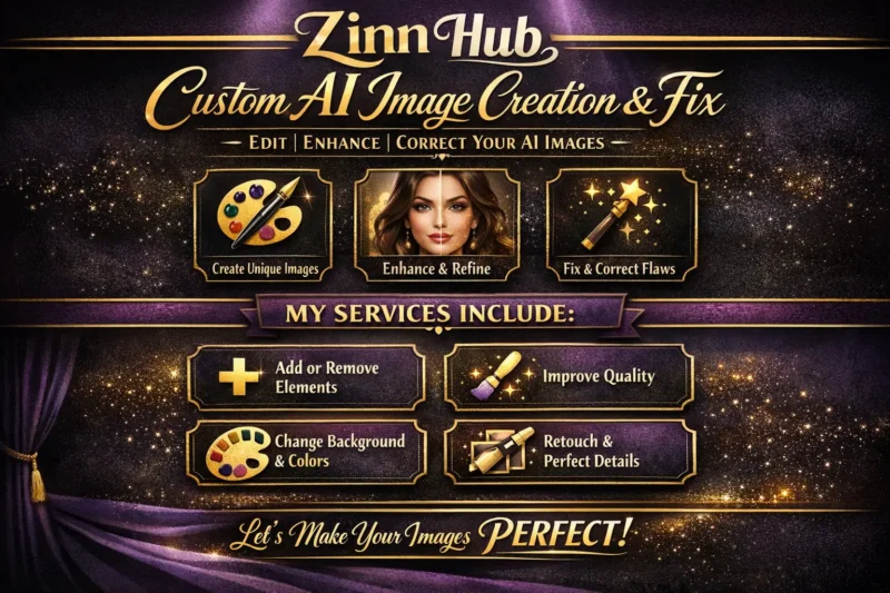 Transform your ideas into visually stunning AI-generated art with Zinn Digital ™'s professional image creation and editing services! Whether you need unique visuals, refined edits, or custom designs, we deliver high-quality results tailored to your exact requirements.