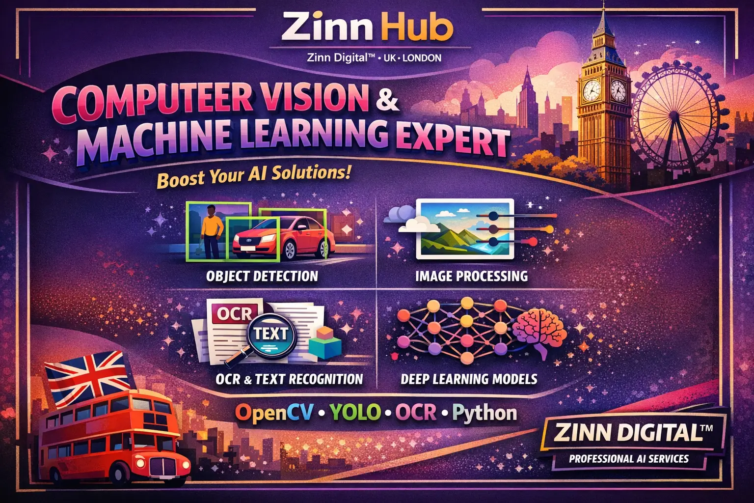 Zinn Digital ™ possesses extensive experience in the field of Machine Learning and Deep Learning. Based in London, England, we have delivered numerous projects in Python, Machine Learning, Computer Vision, Deep Learning, Data Visualisation, Data Preprocessing, Model Training, and Web Scraping using Python Jupyter Notebook and Google Colab with various Python packages and frameworks.