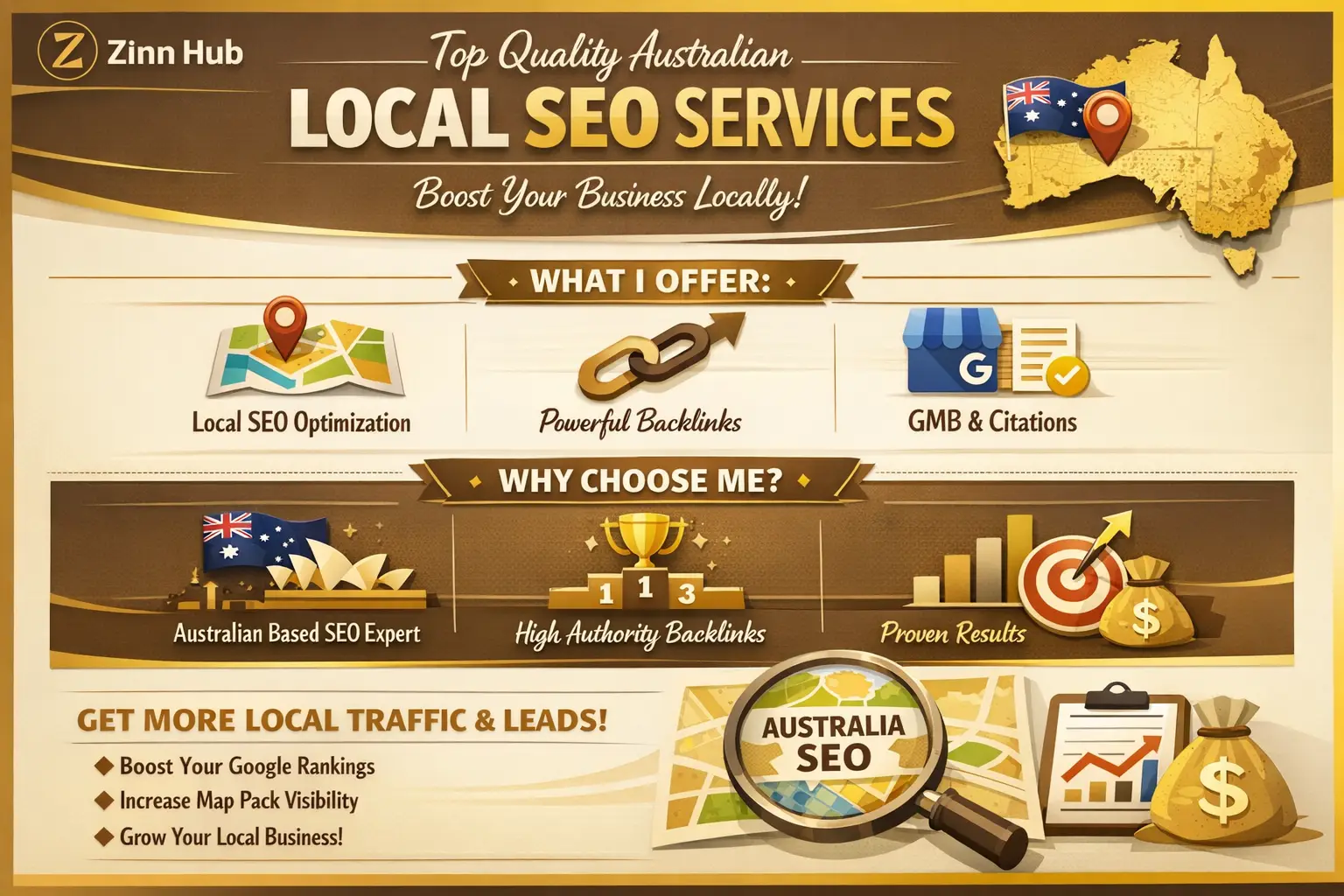 My approach is 100% white-hat, ensuring safe and sustainable growth for your business. Whether you're a local store, service provider, or online brand targeting Australian audiences, Zinn Digital ™ will help increase visibility, drive organic traffic, and build strong domain authority. Based in London, England, with years of SEO expertise, we deliver results that last.