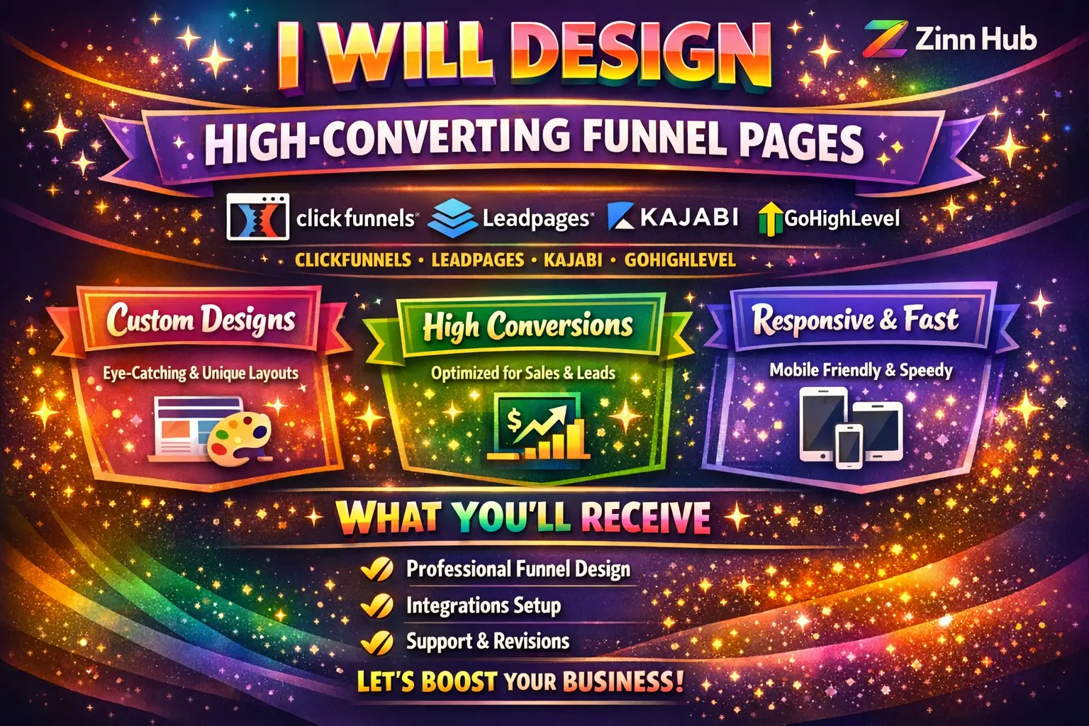 Zinn Digital™ are high-end landing page and funnel design experts, crafting premium, conversion-focused experiences using ClickFunnels, Leadpages, GoHighLevel, Kajabi, Mailerlite, and Thrivecart. Whether you need a ClickFunnels landing page, a GoHighLevel funnel, or a refined sales funnel setup, we help position your brand exactly where it belongs—at the top. Based in London, England, we bring strategic expertise to every project.