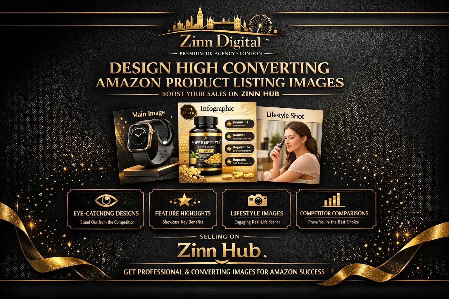Stand out in the competitive Amazon marketplace with our **high-converting product images** specifically designed to **capture attention** and **drive sales**. At Zinn Digital™, we specialise in creating stunning **LIFESTYLE IMAGES**, compelling **INFOGRAPHICS**, and **ENHANCED MAIN IMAGES** that ensure your listings look both **professional** and **persuasive**. Let us elevate your brand with creative, bespoke designs tailored to your unique products!