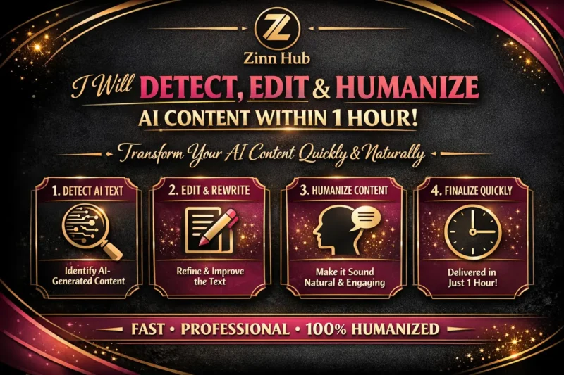 If your AI-generated content sounds robotic or dull, I'm here to fully humanise it. I will rewrite, edit, and improve your content to make it clear, natural, and easy to read. From blog posts to articles, I'll give your words a human touch with better flow, tone, and quality. Our services at Zinn Digital ™, based in London, England, include AI content rewriting, editing, enhancement, and optimisation—all focused on making your content sound authentic and engaging.