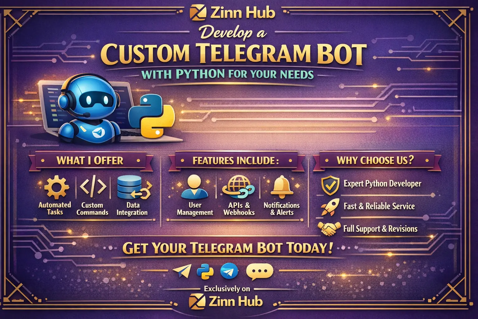Zinn Digital ™, based in London, England, will create a fully functional and custom Telegram Bot using Python and the Telegram Bot API. Whether you need a simple bot for personal use or an advanced bot with complex integrations, we can deliver the perfect solution tailored to your requirements.