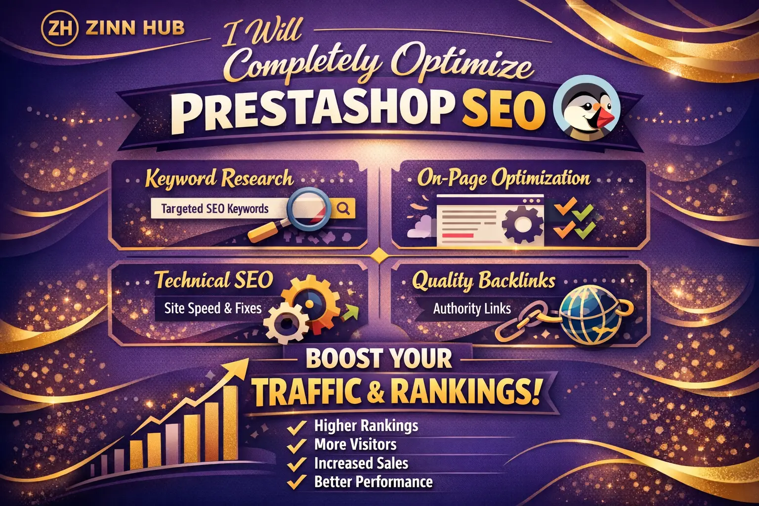 Boost your PrestaShop store's visibility with expert SEO services from Zinn Digital ™. From technical audits and multilingual SEO, we help you rank higher on Google and drive more organic traffic. Perfect for growing your eCommerce sales without advertising spend.