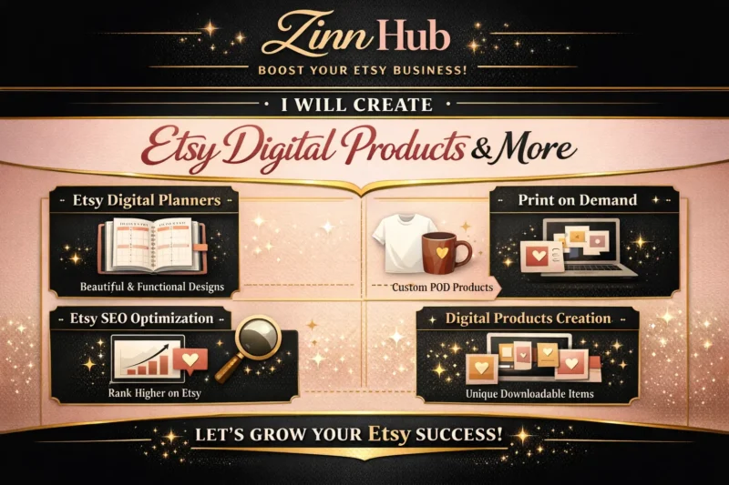Digital products offer a passive income stream, relieving you of production, shipping, and order fulfilment stress. Leveraging our extensive experience, Zinn Digital ™ will establish a fully automated Etsy shop with top-selling products, optimising SEO for enhanced store visibility.