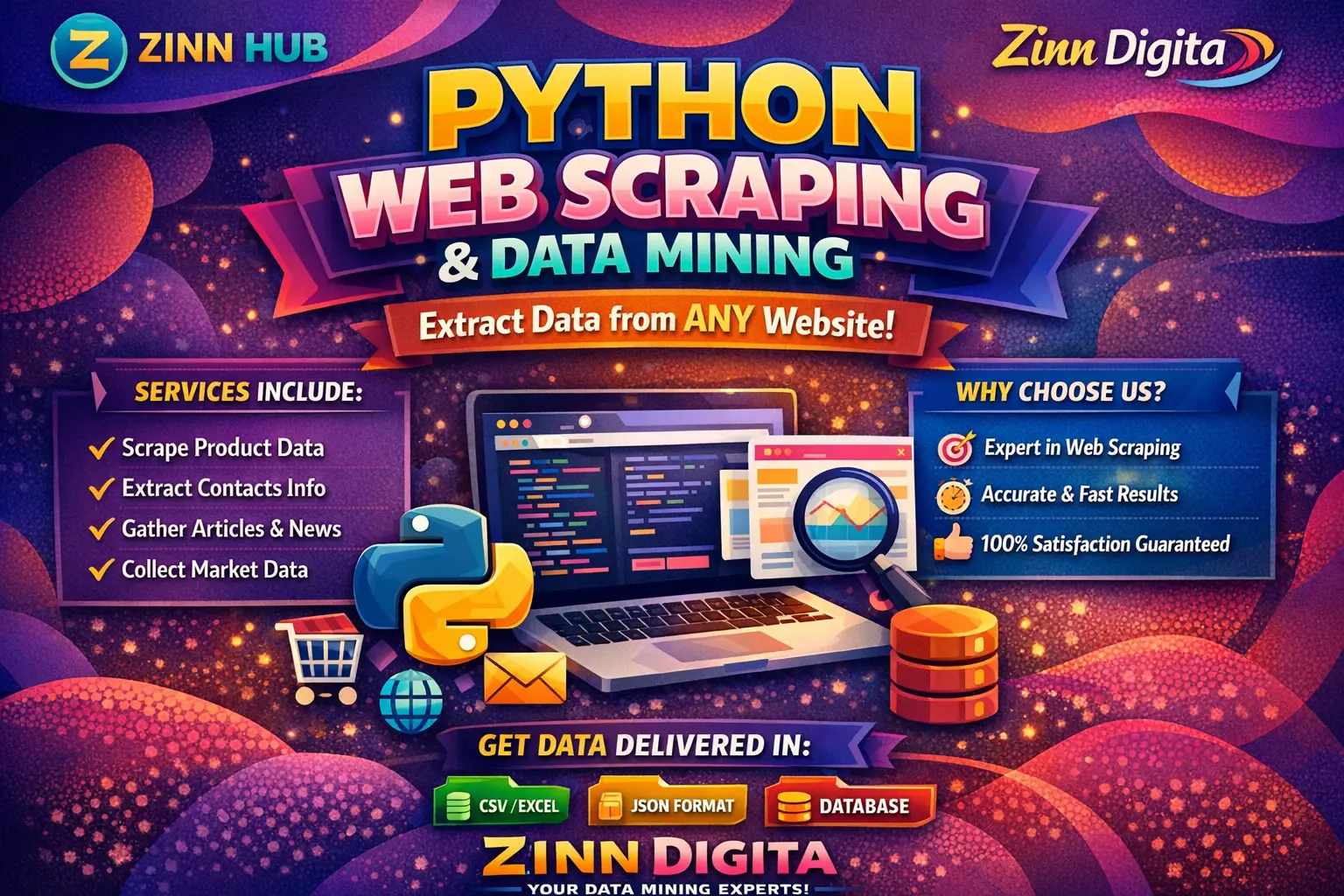 Hello! I'm Zinn Digital ™, a Python developer with years of experience in web scraping, data mining, and data extraction. Based in London, England, I provide fast, professional, and tailored solutions for all your data needs, whether it's from static or dynamic websites, e-commerce platforms, or business directories.