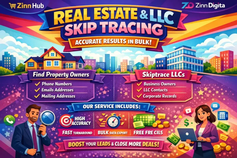 I specialise in professional **real estate skip tracing** and lead generation. Whether you're a wholesaler, investor, realtor, or agent, and you're looking for top-quality skip tracing services at a competitive price with over 99% accuracy, you're in the right place! Based in London, England, Zinn Digital ™ provides skip tracing for business entities such as LLCs, Inc., Corps, and Trusts. You can expect 15,000 leads delivered within 24 hours. We utilise advanced tools like TLO, LexisNexis, Intelius, and BeenVerified to accurately identify property owners.