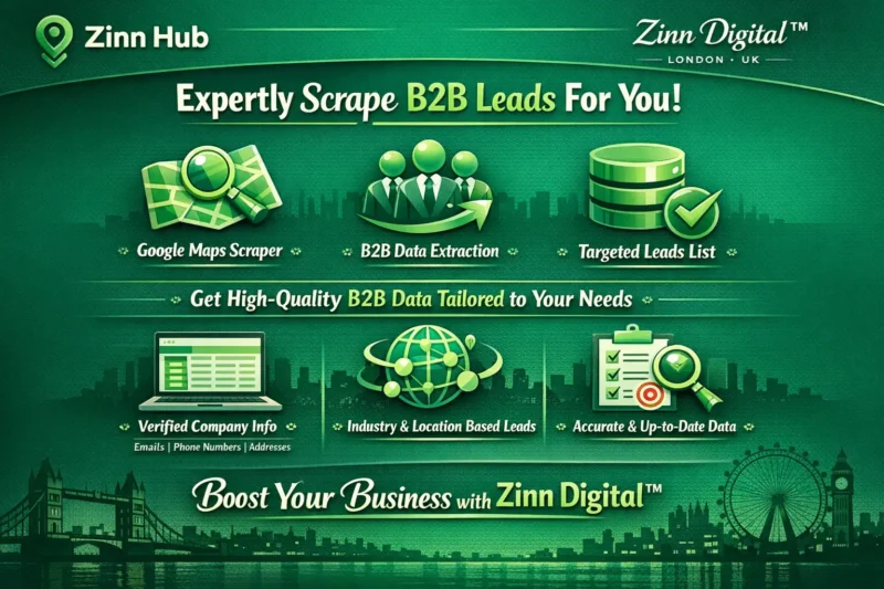 Save your time and energy - let our years of experience from London, England elevate your business. Reach out to Zinn Digital ™ for Google Maps scraping, web scraping, or any manual web research through Zinn Hub.