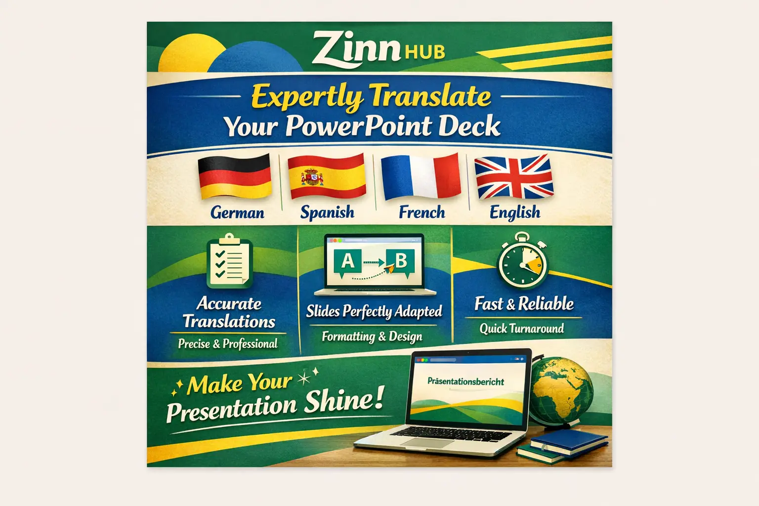 We're Zinn Digital ™, Certified Translators (CT) with 12+ years of experience translating and localising PowerPoint presentations for businesses and professionals. Based in London, England, our team is fluent in Spanish, German, English, French, and Italian, delivering translations that read smoothly, look polished, and reflect your brand's tone.