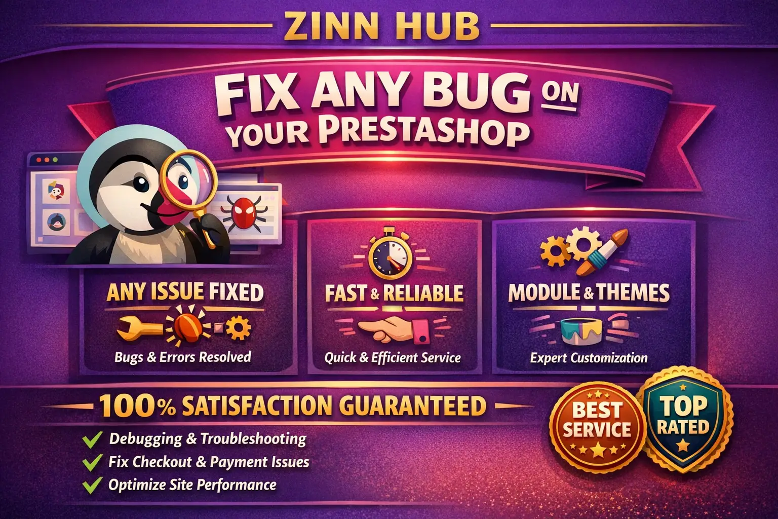 Zinn Digital ™ will fix PrestaShop from simple to super complex issues, any bugs, and errors. This Zinn also supports customisation of themes or modules. If you are interested in it, we would love to do it for you