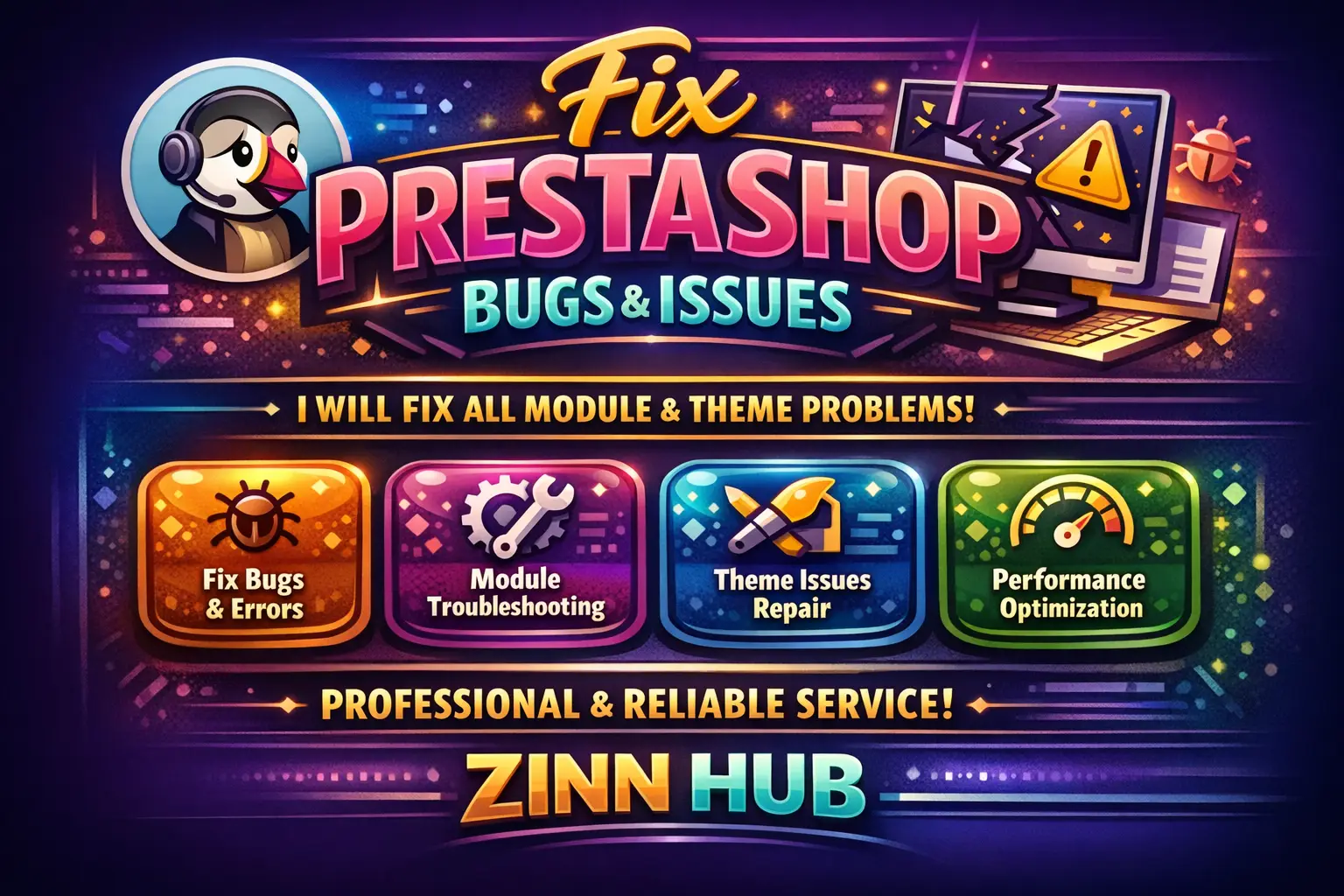 As a Prestashop-certified developer, Zinn Digital ™ can fix any bugs, errors, or issues that may