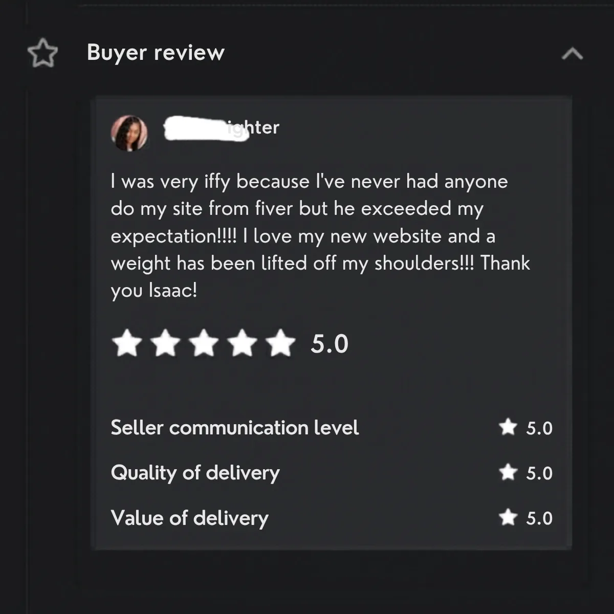 I was very iffy because Ive never had anyone do my site from fiver but he exceeded my expectation!!!! I love my new website and a weight has been lifted off my shoulders!!!! Thank you Isaac!