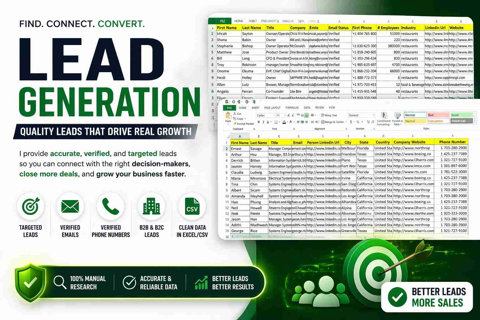 I understand that reaching the right decision-makers is essential to business growth. That’s why I manually research and compile each lead using LinkedIn and trusted data verification tools. You’ll receive a list of key contacts within your specific industry, including verified emails, phone numbers (when available), job titles, and LinkedIn profiles.