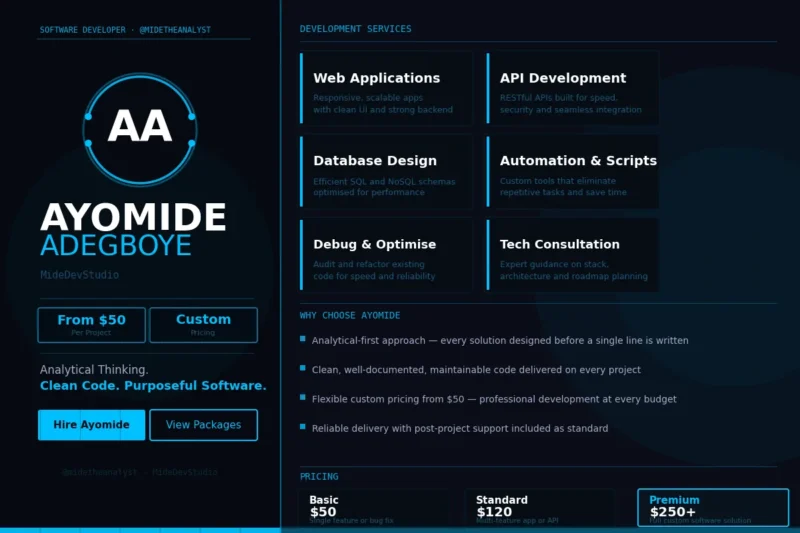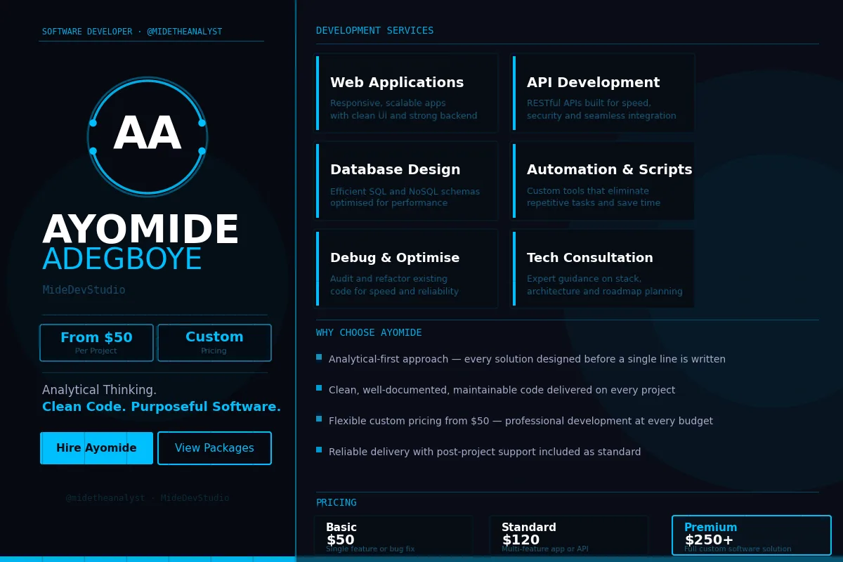 My name is Ayomide Adegboye, known professionally as Midetheanalyst, and I am a skilled and analytical Software Developer who builds clean, functional, and scalable software solutions tailored precisely to the needs of each client and project. I bring a unique combination of technical development expertise and an analytical mindset to every project — not just writing code, but thinking deeply about the problem, architecting the right solution, and delivering software that genuinely works for the people who use it.