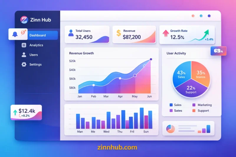 A modern dashboard experience that makes analytics easy to read and interact with. The design includes charts, widgets, tables, filters, and responsive layouts.