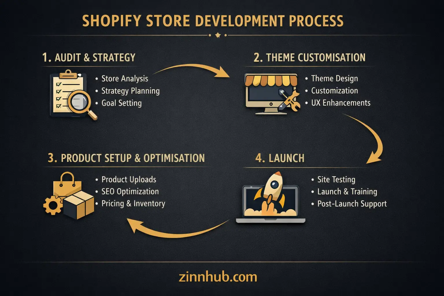 I don't just design stores — I build complete ecommerce systems. Before touching your theme, I analyse your target audience, product positioning, customer journey and conversion bottlenecks. Then I implement a strategy that addresses the real reasons stores lose sales — poor structure, confusing navigation, weak trust signals and slow checkout flows.