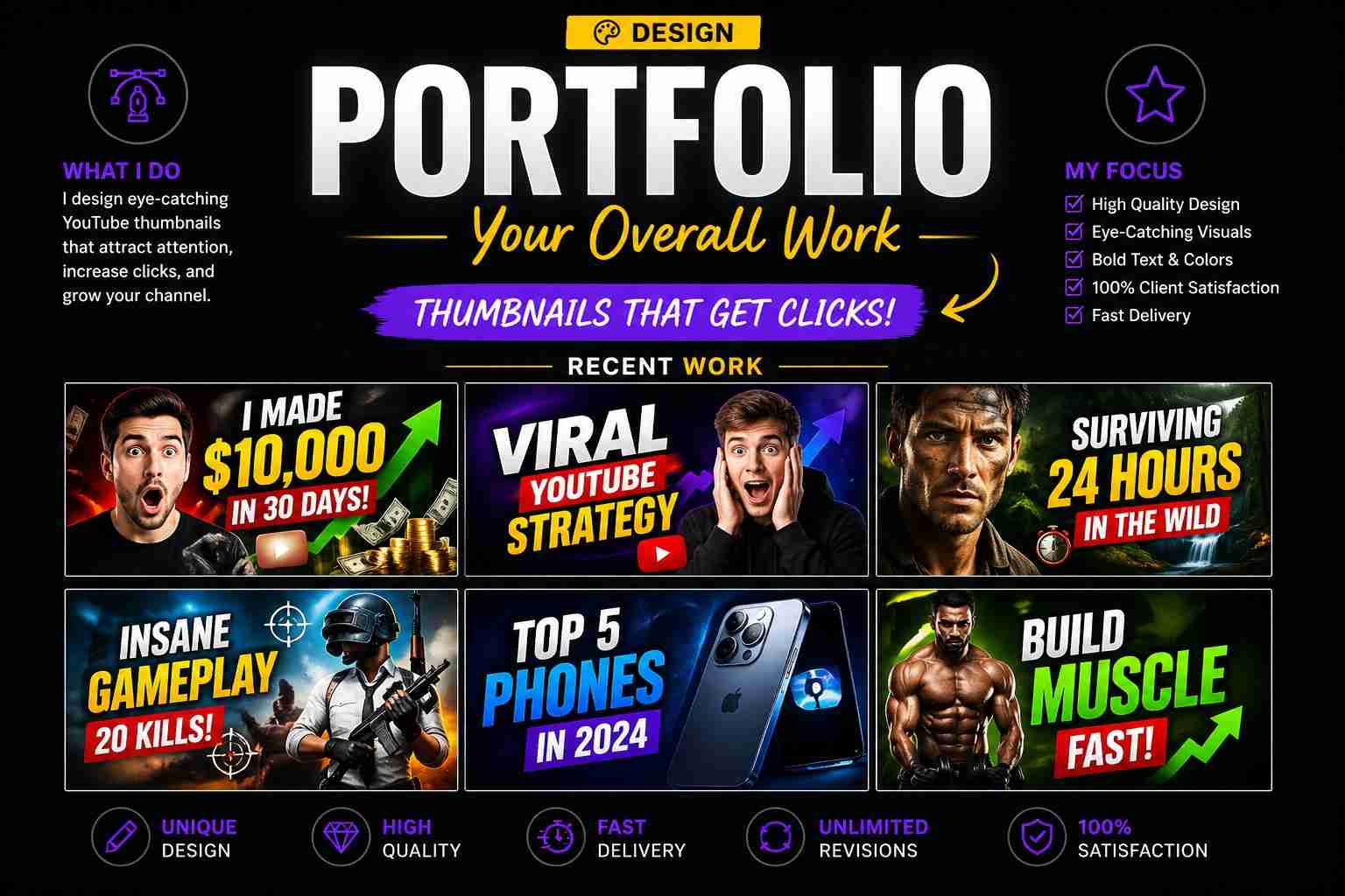 This portfolio showcases my YouTube thumbnail designs, focused on creating bold, eye-catching visuals that increase clicks and help content stand out. I use strong colors, clear text, and modern layouts to deliver thumbnails that look great on both mobile and desktop across different content niches.