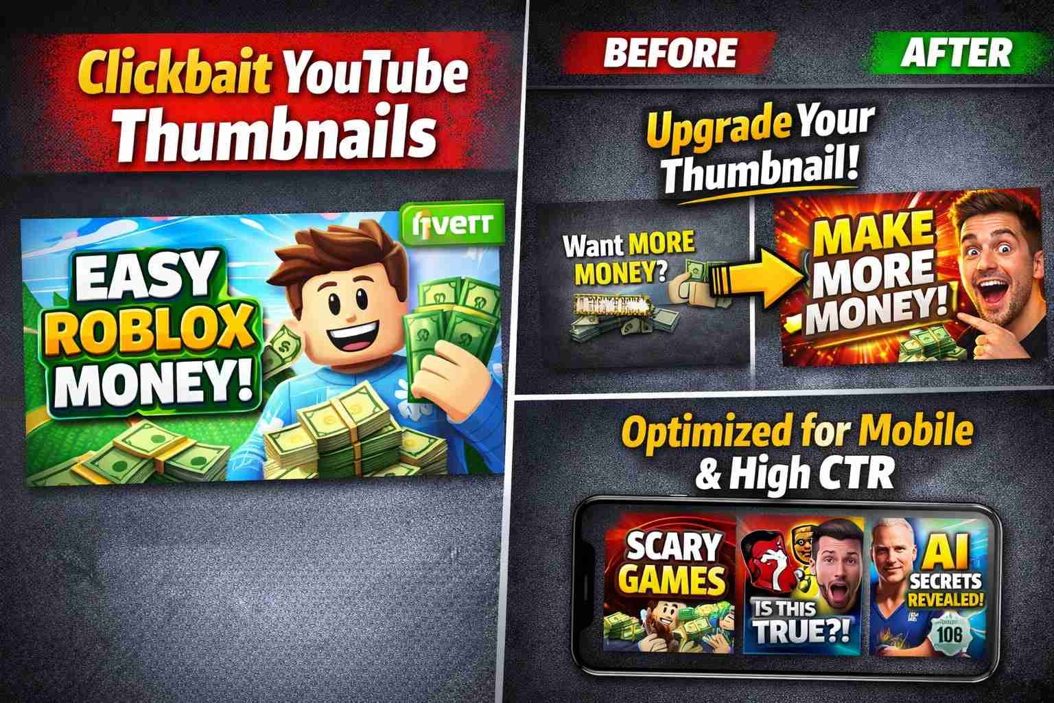 Each thumbnail I create is carefully designed using strong color contrast, bold typography, and modern layouts. I make sure that every design looks great on both mobile and desktop devices, so your content always appears professional and appealing no matter where it is viewed. My goal is not just to make your thumbnails look good, but to make them perform better and attract more viewers.