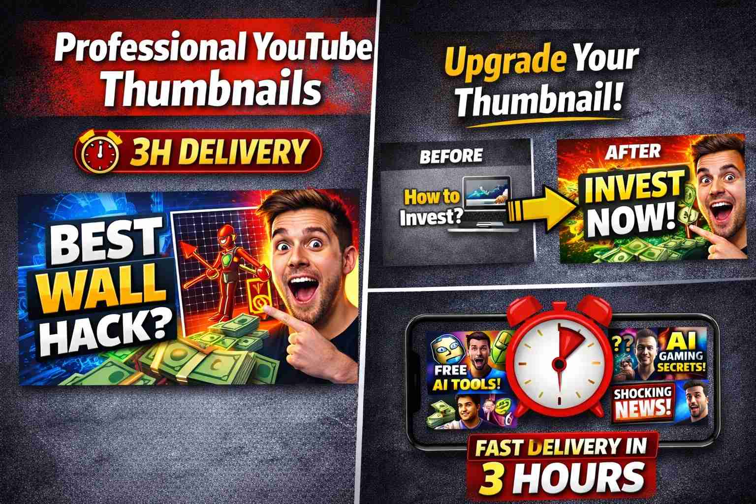 4 high-quality YouTube thumbnails with bold designs, source files included, and priority delivery. source files (PSD/Canva) are included in Premium packages.