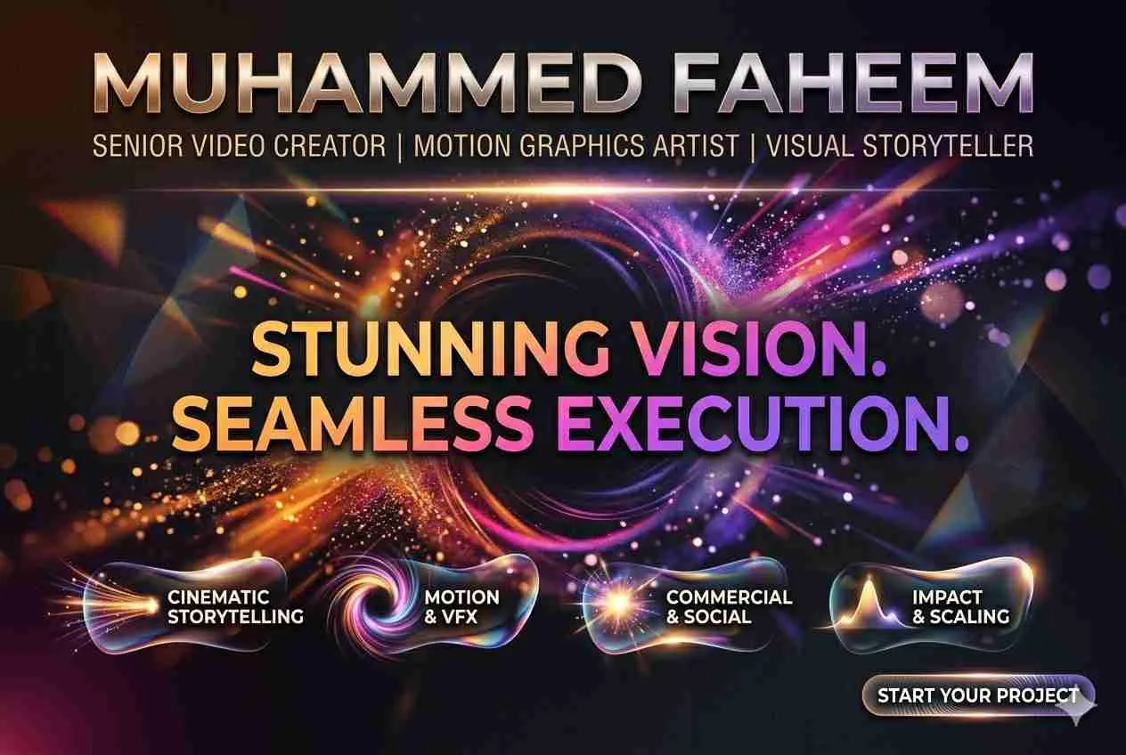 I am Muhammed Faheem, a Senior Video Creator specializing in cinematic editing and motion graphics. With a focus on high-impact visual storytelling, I help brands create stunning video content that engages audiences and drives measurable growth across all digital platforms.