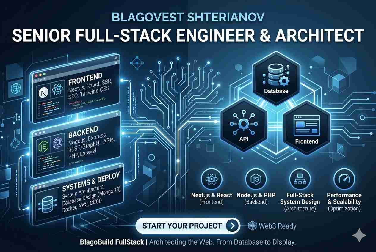 My name is Blagovest Shterianov, and I am a Full-Stack Engineer who builds the bridge between complex business logic and intuitive user experiences. With over 6 years of experience across the entire development lifecycle, I specialize in the JavaScript/TypeScript ecosystem (React, Next.js, Node.js) while maintaining deep professional expertise in PHP.